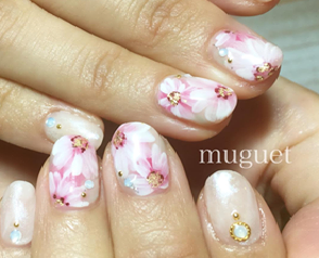 *フラワーデザインネイルのジェルネイル:数種類のフラワーデザインからお好きなデザインを選び、ジェルネイルで手描きアートします。